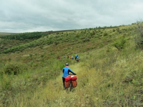 9:25 | 2:00 | 0 | 1,5 | Выход. Ночью был дождь, полевая дорога размокла. Идти почти невозможно. Постоянно выковыриваем грязь из велосипеда. Начинается дождь. С трудом вылезаем на дорогу. Очищаем велосипеды, чтобы можно было ехать. | Сильно размокшие грунты |